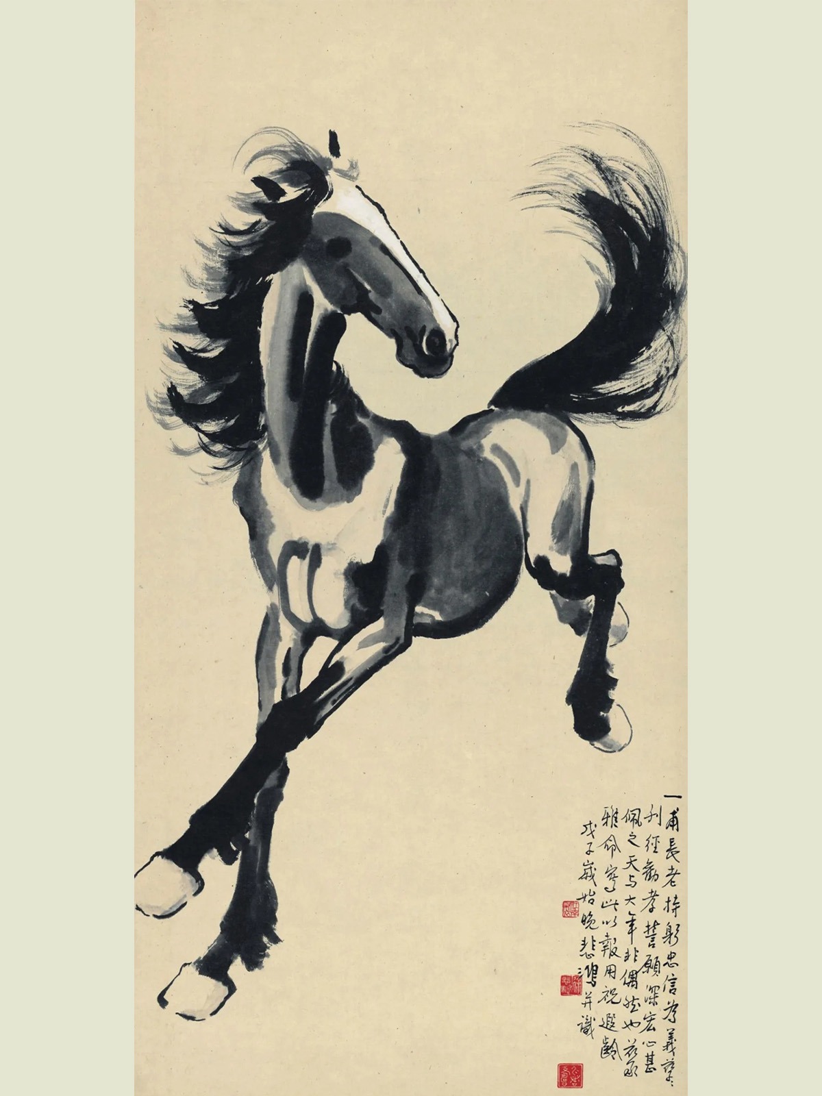 这份对马的热爱,在徐小阳祖父徐悲鸿先生笔下,则升华成了精神图腾。马成为连接个人命运、时代洪流与民族精神的载体,盛放着深沉的家国情怀。在徐悲鸿笔下,马永远昂首挺立,即便在静止的画面中也蓄满了奔腾之势。