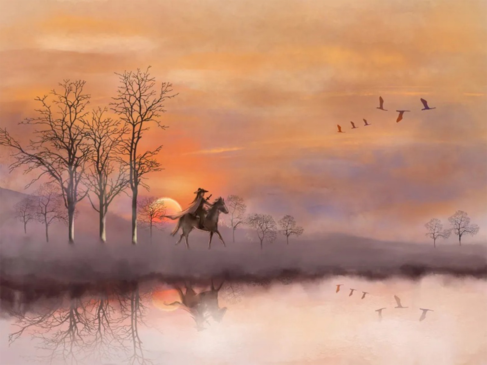 他描绘金庸笔下郭靖的那匹汗血宝马,既是生死与共、冲锋陷阵的战骑,也是夕阳下驮着郭靖黄蓉信步湖畔的悠闲伴侣。一匹马的两种状态,完美对应了侠客的两种人生面向:肩负使命的奋进,与享受生命的自由。而杨过在人生最困顿、自觉前途无望时,在市集偶遇了一匹被虐待的形销骨立食不果腹的瘦马,他买下它,本是出于一时意气,未曾想这匹看似羸弱的马,竟是一匹千里马。